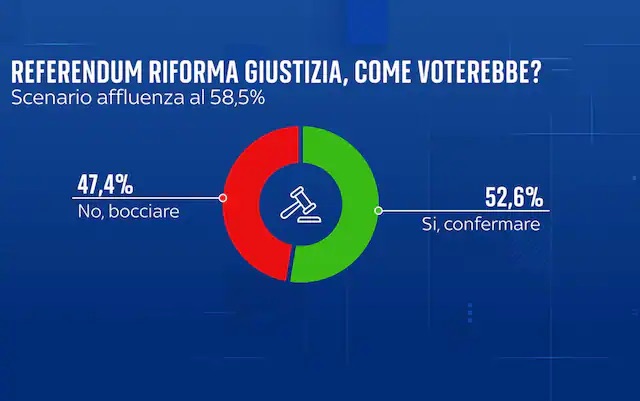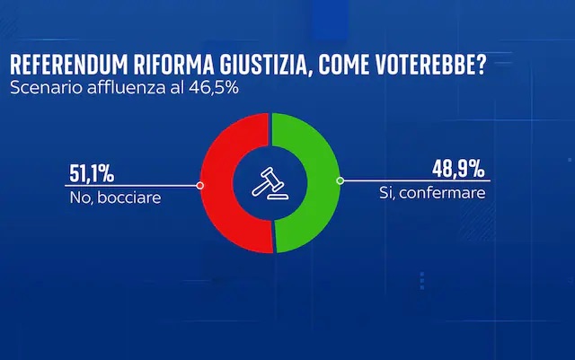 La consultazione del 22 e 23 marzo divide gli italiani. In caso di bassa affluenza (al 46,5%), secondo i dati raccolti dall’istituto di ricerca YouTrend per Sky TG24 la spunterebbe il No (51,1 contro 48,9%).