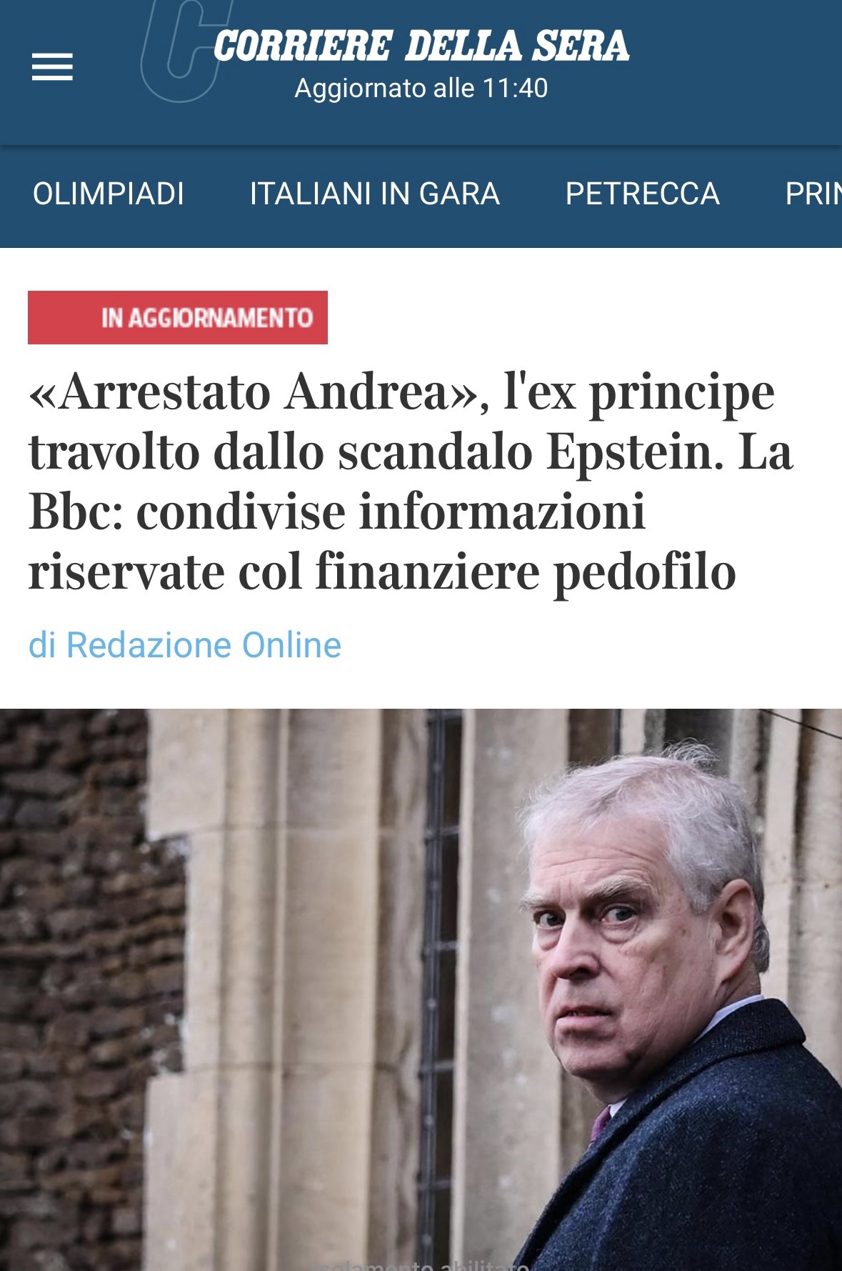L’ex principe Andrea è stato arrestato nella sua residenza di Sandringham.