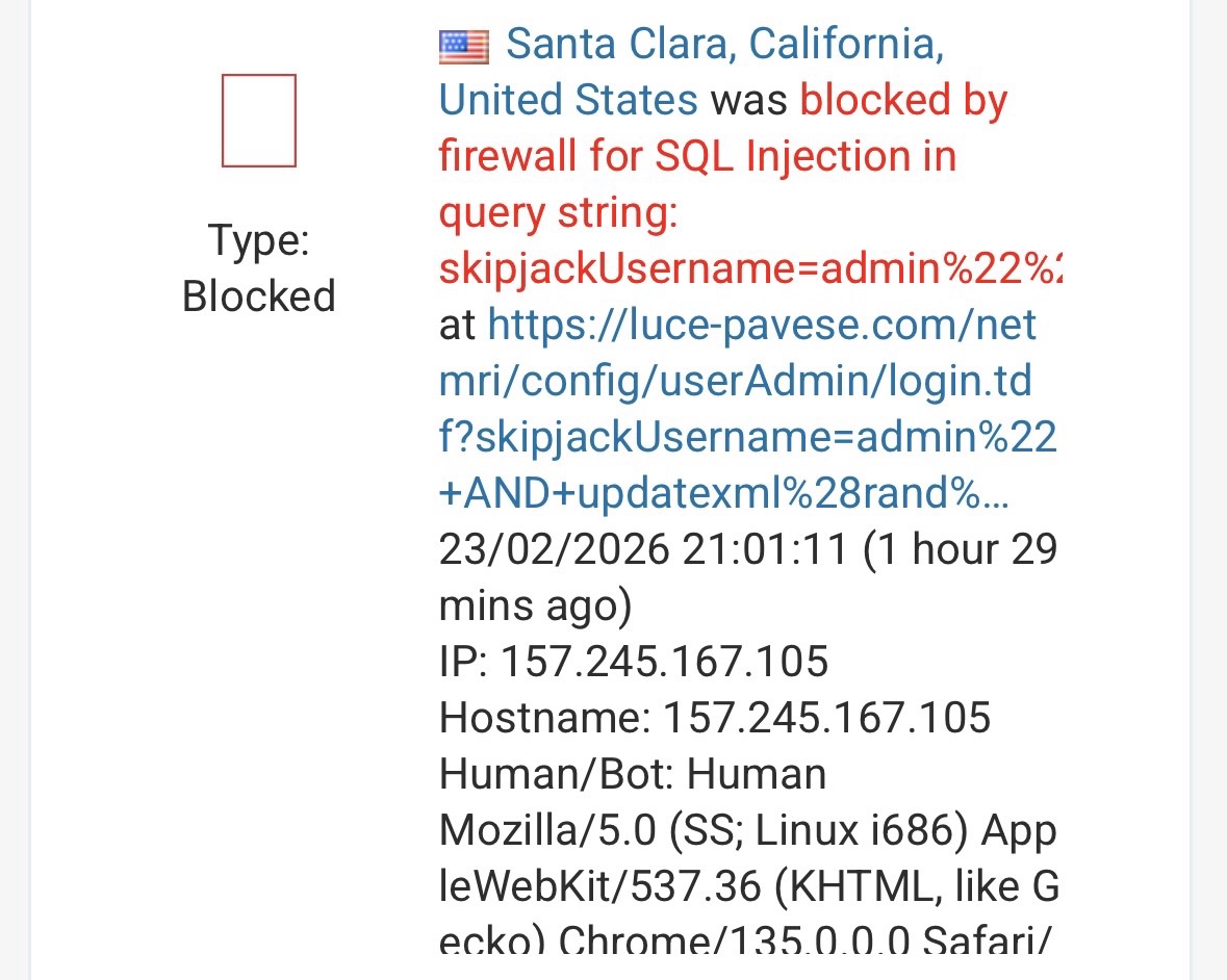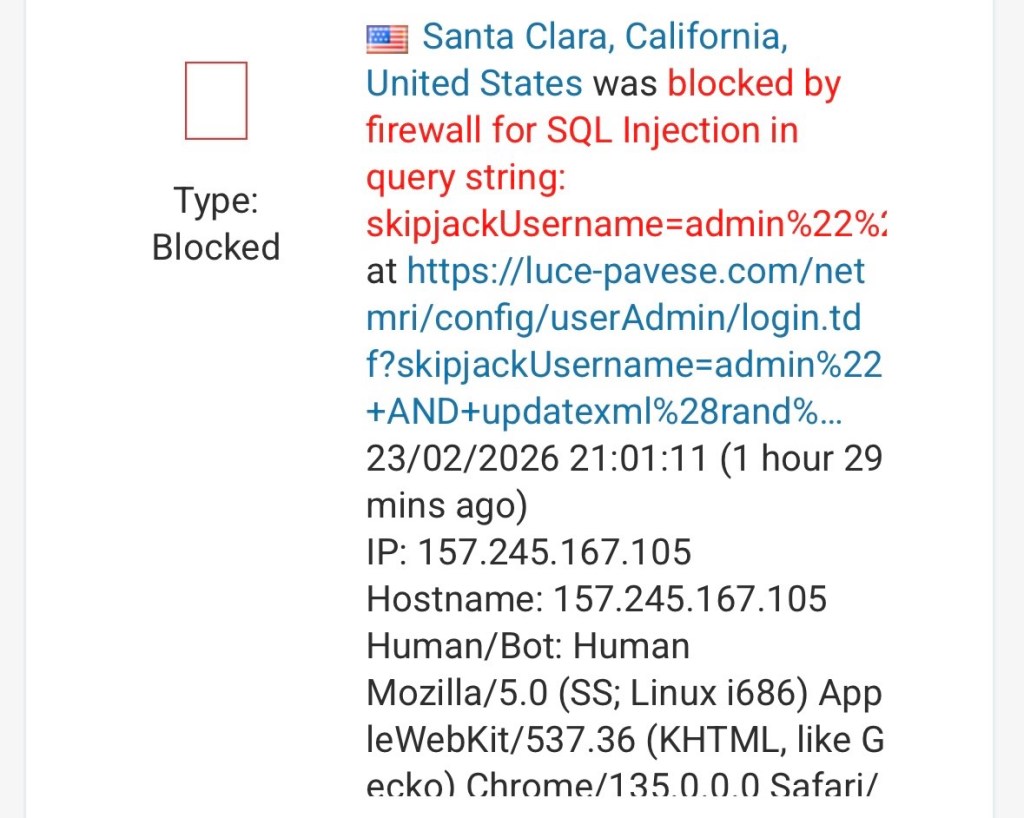 L’IP (157.245.167.105) viene da Santa Clara, California. Ma non farti ingannare: non c’è nessuno a Santa Clara fisicamente. Quell’IP appartiene a DigitalOcean, un servizio di cloud hosting famosissimo e molto economico. Visto che ieri li hai bloccati da Singapore e dall’Olanda, oggi hanno affittato un serverino virtuale in California per 5 dollari, ci hanno caricato sopra questo script d’attacco e lo hanno fatto partire. (Il firewall dice “Human”, ma è palesemente uno script automatizzato che simula un browser Chrome).