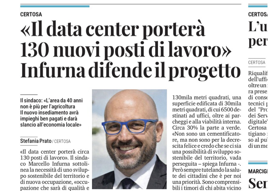 Così dal quotidiano locale, il sindaco in foto, difende il progetto del data center a Certosa.