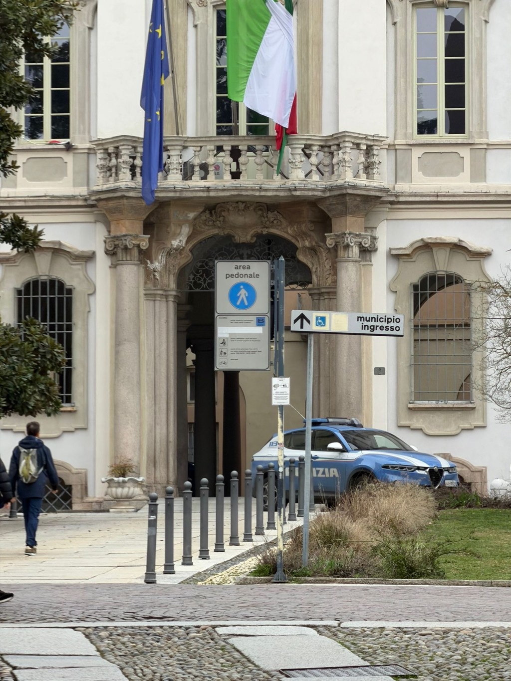 Sfilata di mezzi e lampeggianti, davanti a Palazzo Mezzabarba a Pavia.