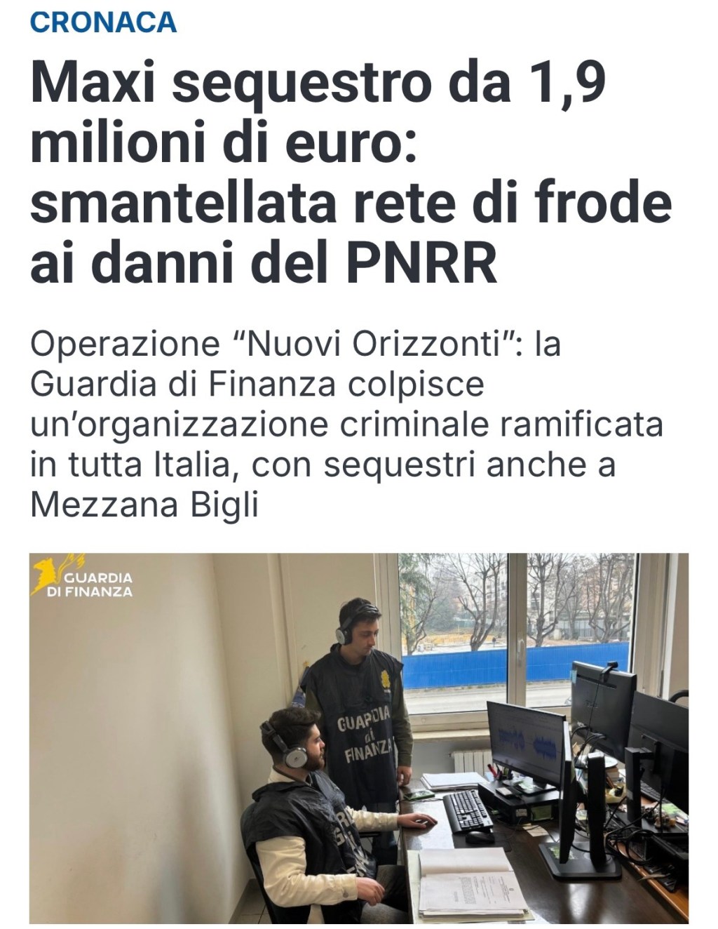La Guardia di Finanza ha eseguito un sequestro da 1,9 milioni di euro nell’ambito dell’operazione “Nuovi Orizzonti” contro una rete criminale che ha frodato fondi pubblici, con sequestri anche a Mezzana Bigli. L’indagine, coordinata dalla Procura Europea di Torino, riguarda 12 persone accusate di associazione a delinquere e truffa aggravata.