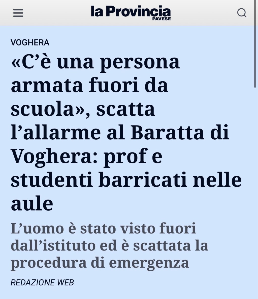 Momenti di forte tensione nella mattinata di oggi, martedì 10 marzo, al liceo Baratta di Voghera, dove verso le 12 è scattato l’allarme per la presenza di una persona armata fuori dall’istituto. La segnalazione ha fatto scattare immediatamente le procedure di emergenza all’interno dell’istituto: studenti e prof si sono barricati nelle aule, con le porte chiuse, lontani dalle finestre mentre venivano effettuate le verifiche sulla segnalazione.