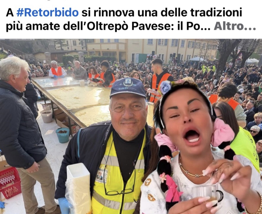Panico al Polentone di Retorbido: sul palco-carro attrezzi spunta un’influencer… ma con tutti quei filtri nessuno ha capito chi fosse.