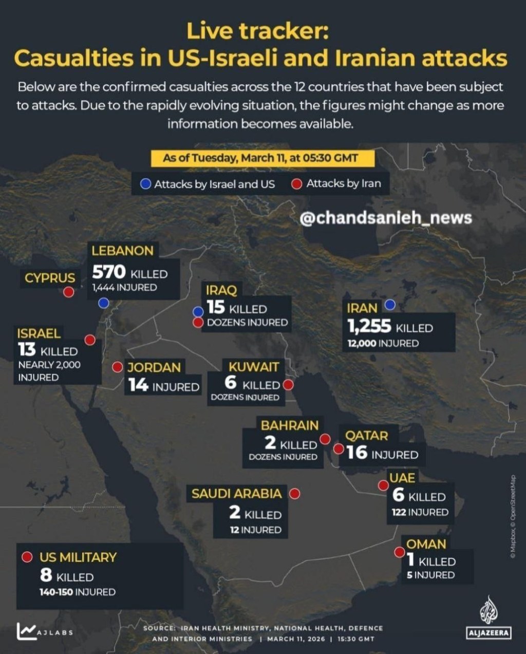 Vittime degli attacchi statunitensi-israeliani e iraniani (al 11 marzo 2026) secondo Al Jazeera (Qatar):
