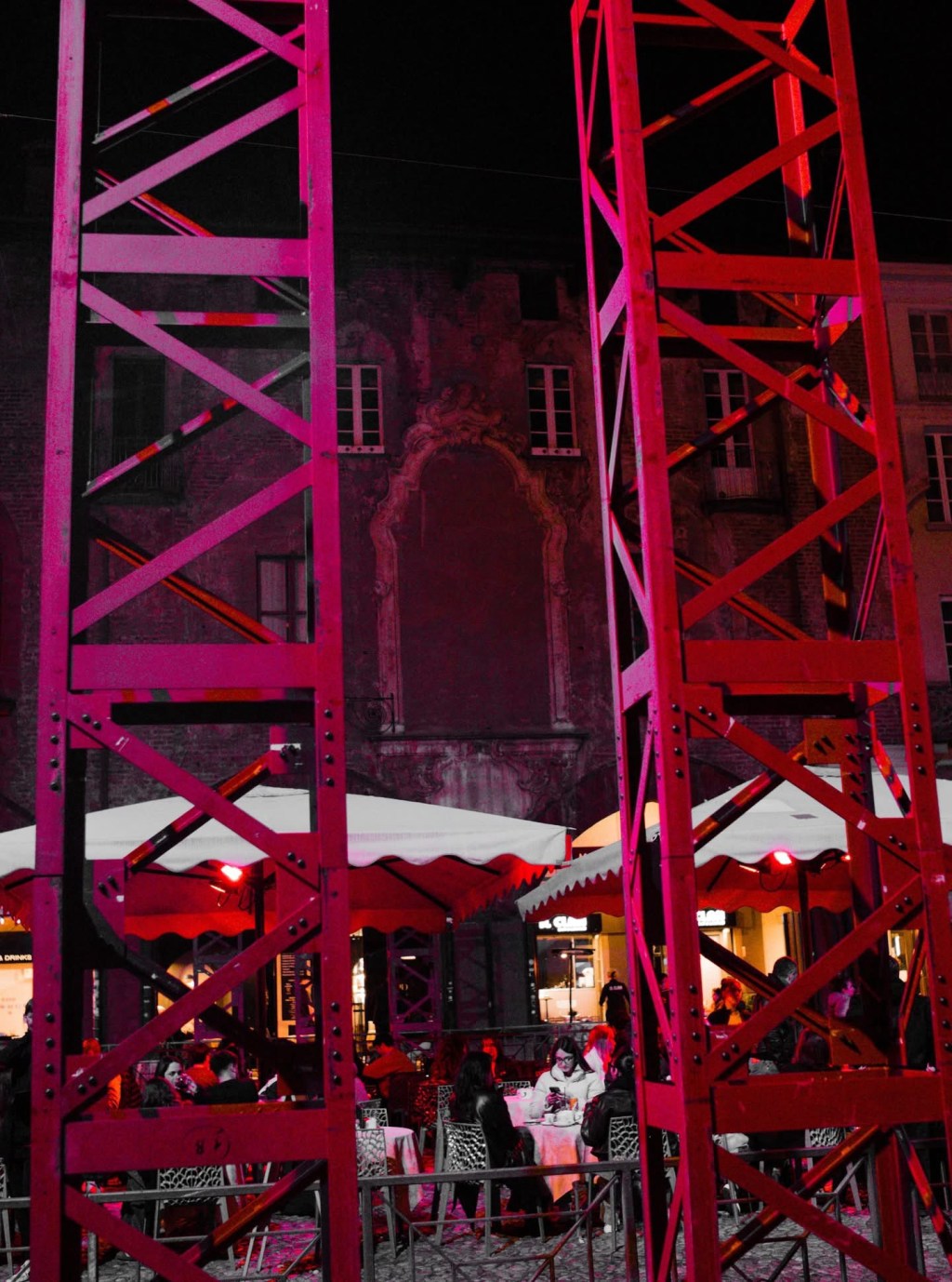 Notturna dal capolavoro dei camini in costruzione da Piazza della Vittoria a Pavia. Capolavoro a colori.