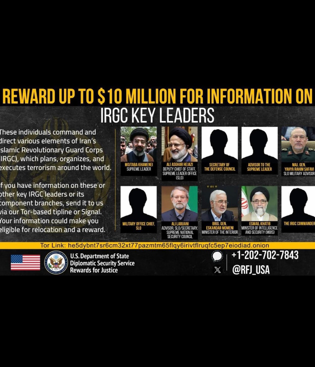 Il dipartimento di giustizia americano ha emesso una taglia da 10 milioni di dollari sulla nuova guida suprema iraniana, Mojtaba Khamenei e su altri giannizzeri.