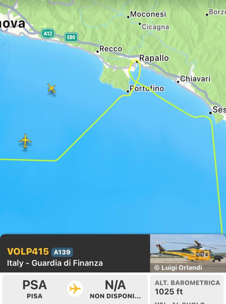 Inchino su sulla sua testa, e circuito su Santa Margherita… con la rotta che diventa giallo-bionda. È sceso di quota qui.