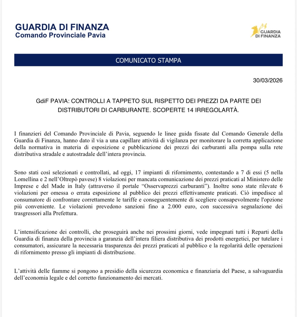 Lomellina e 2 nell’Oltrepò pavese) 8 violazioni per mancata comunicazione dei prezzi praticati al Ministero delle